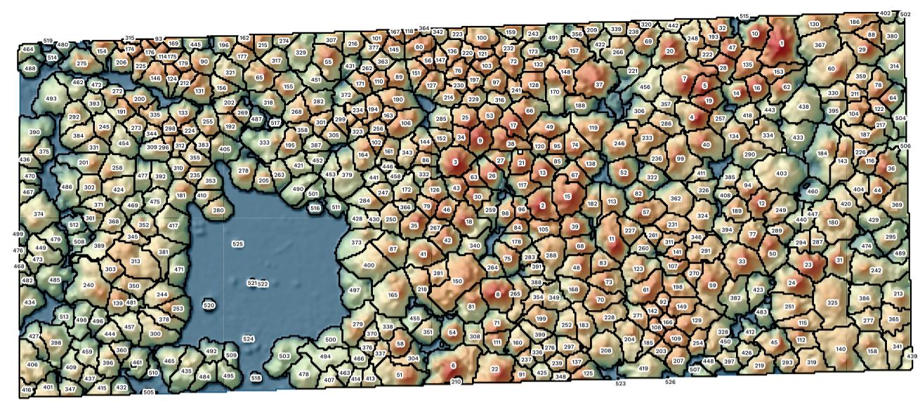 From the lidar data we are able to generate a map of every single tree on the property. For every numbered tree on the map we also have the background data of how high it is and the GPS placement.
